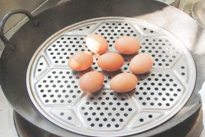 1.锅内加入适量的清水,把洗干净的鸡蛋放在篦子上,盖上锅盖上气以后蒸8分钟。到时间后把蒸好的鸡蛋从锅中取出,放入清水中透凉敲碎外壳备用。