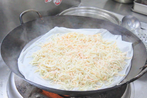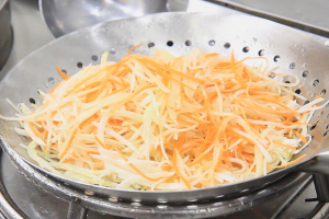 3.锅内开始烧水,放入篦子铺上白纱布,水烧开后把萝卜丝抖散放在篦子上面,然后蒸3分钟即可。