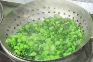 2.锅内烧水,加入少许植物油和食盐,水烧开以后把芥菜倒入锅中,快速焯水20秒钟,去除苦涩味,倒出控水备用。