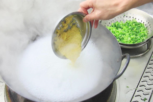 3.锅内再烧水, 水烧开以后把小米倒进去,轻轻地推动让小米均匀受热,加入一勺食盐和鸡粉,搅拌均匀,水再次沸腾以后转为小火。