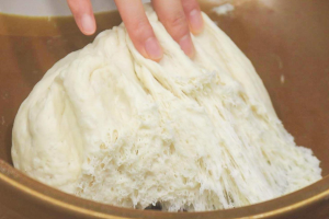 1.和面盆中放入小麦面粉300克、酵母3克、少许食盐搅拌均匀,少量多次地加入常温水搅成面絮,然后揉成光滑的面团,密封发酵大约1个小时,把面团发酵原来的两倍大。