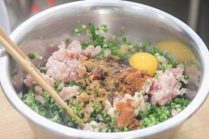 2.一把韭菜切成碎粒,一段大葱剁碎,一小块生姜切成姜末,全部放在一起,加入植物油搅拌均匀防止出水,加入五花肉馅、食盐2克、五香粉2克、十三香1克、蚝油5克、老抽3克、一个鸡蛋搅拌调开,最后加入芝麻香油5克搅拌均匀备用。