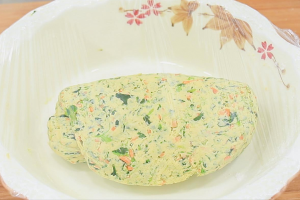 1.一把青菜切成青菜碎放在盆中,半根胡萝卜切成胡萝卜碎放在盆中,加入玉米面100克、面粉200克、加入食盐2克(一勺)、酵母3克,再倒入不超过40度的温水,先搅成面絮,再揉成光滑的面团,盖上保鲜膜饧发40分钟。