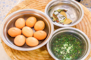 3.锅内烧水,倒入准备好的辅料,倒入泡发的茶叶,加入生抽10克、料酒10克、老抽2克、食盐3勺、味精1勺搅拌均匀后,开中小火煮5分钟煮出料头的香味,把煮好的料汁浇在鸡蛋上,料汁的量要漫过鸡蛋盖上一层保鲜膜腌制2个小时,时间到了就可以把鸡蛋捞出来摆放在盘中食用。