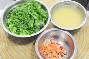 1.一小把芥菜切成碎末;一把小米放入清水浸泡10分钟清洗干净;几个红枣切成小粒;一小块胡萝卜切成丁。
