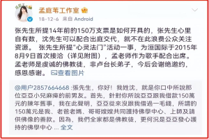 张志鹏又发文,称其曾帮孟庭苇归还她借前男友沈正福的150万借款。但被沈正福很快发文打脸,说所谓150万借款并不存在,实际是请供佛像的善款,自己可以出庭作证……