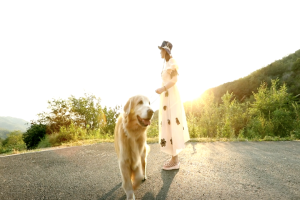 牵着大狗狗在满是泥土香的小路上,顶着一张红扑扑的脸蛋,永远的都不知道累。