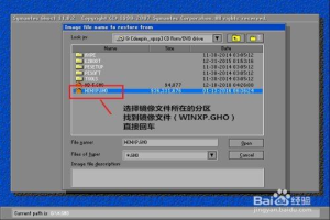 2.选择镜像文件所在的分区,找到镜像文件(WINXP.GHO),单击OPEN(打开)。