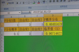 3)制作简单的F分布计算器Excel输入下图中的标题、数据和公式非常简单,D2单元格为“=fdist(A2,B2,C2)”,D4单元格为“=finv(A4,B4,C4)”。