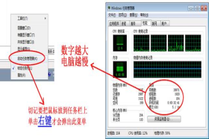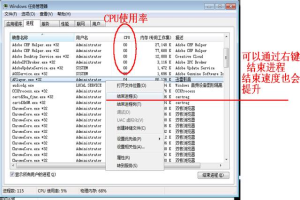 CPU栏目中的数字越大,电脑越卡,通过内存栏目很清楚地知道容量的大小,立即定位到异常软件处,选择此项目,右键[偷笑]单击弹出菜单,选择结束过程,计算机运行速度立即提高。