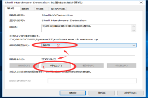 3.双击“Shell Hardware Detection先点击下面的停止,然后禁止上面的选择。