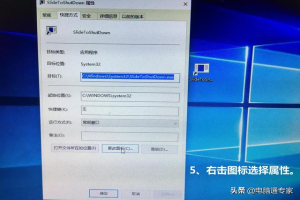 从图1到图4的步骤已经新建了关机按钮,这是我们需要的把关机按钮换成好看的图片标记,如果你不想改变图标图4已成功,你可以双击关机图标试一下了。不要在这里注意slidetoshutdown字母输错了,大小写都可以。接着我们给Win10关机按钮,换个好看的图标: