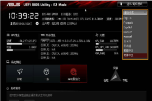 2.然后进入华硕主板BIOS界面结束后,首先找到位于右上角下拉菜单中的简体中文。