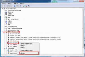 2.然后在设备管理器窗口依次点击展开通用串行总线控制器-USB Root Hub单击鼠标右键选择属性”,如下图所示: