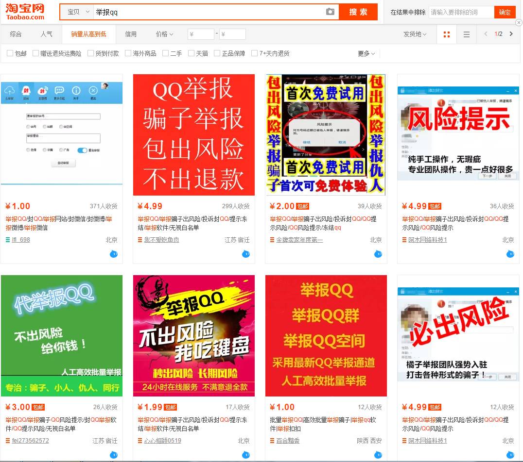 事情发生后,卢松松在各平台曝光,引发了探讨。经过扒皮得知,举报QQ这项业务,淘宝上购买成本极低,而且承诺包出“风险”。