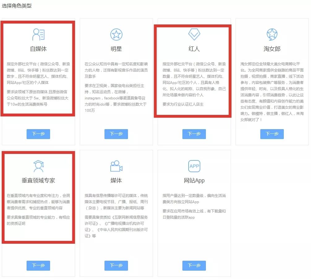 最简单的就是自媒体、红人、垂直领域专家这三个身份来做一个相应的审核。