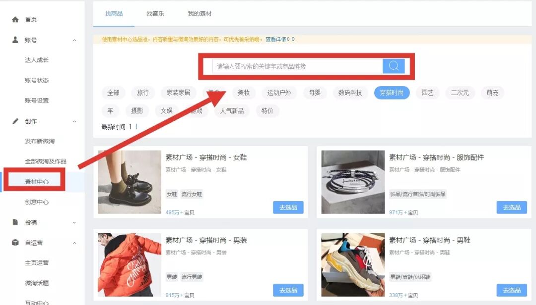 帐号具备了一定权重之后,我们就可以在微淘号的素材中心进行商品选择了,通过搜索可以直接找到大量的商品用于我们内容上的素材。