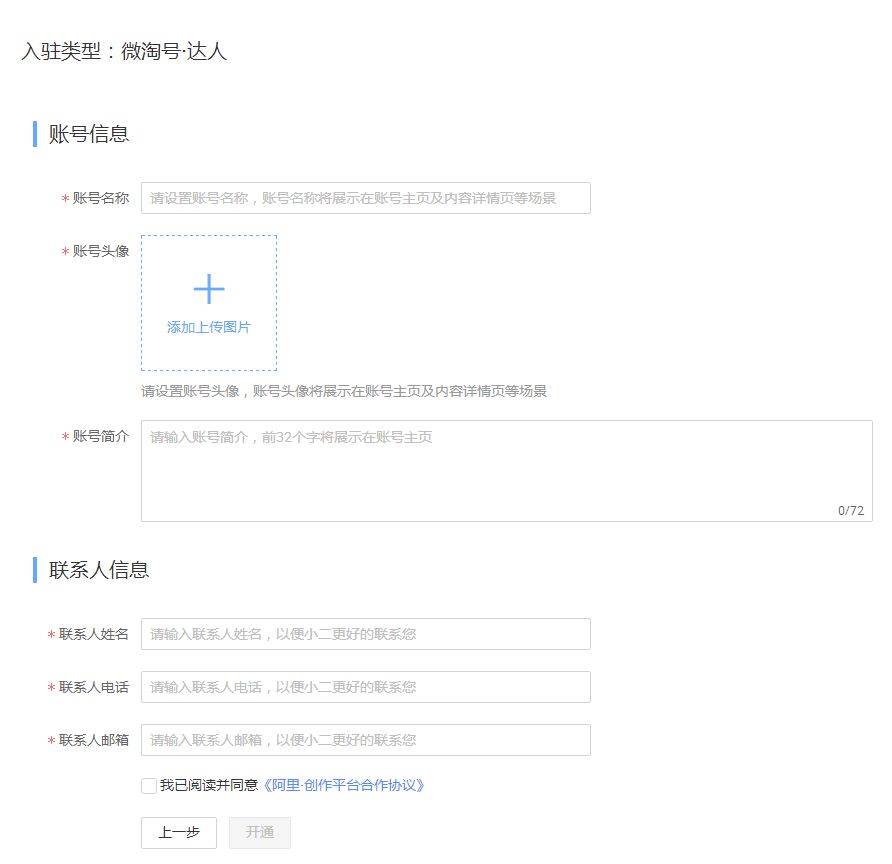 检测完成后下一步就是填写账号信息和联系人信息。作为达人号,不要在自己的帐号名称中融入某商品的品牌名称,这样是难以通过审核的。