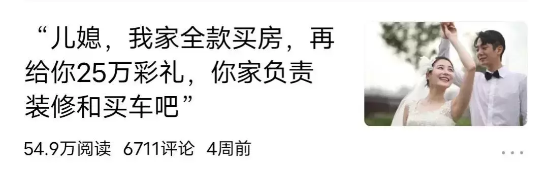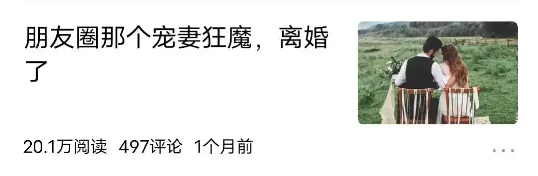 比如:《十点读书》里的《朋友圈那个宠妻狂魔,离婚了》,《儿媳,我家全款买房,再给你25万彩礼,你家负责装修和买车吧!》