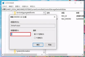 然后,双击打开WriteProtect,将数值数据设置为0,基数为16进制,点击确定退出。如下图所示: